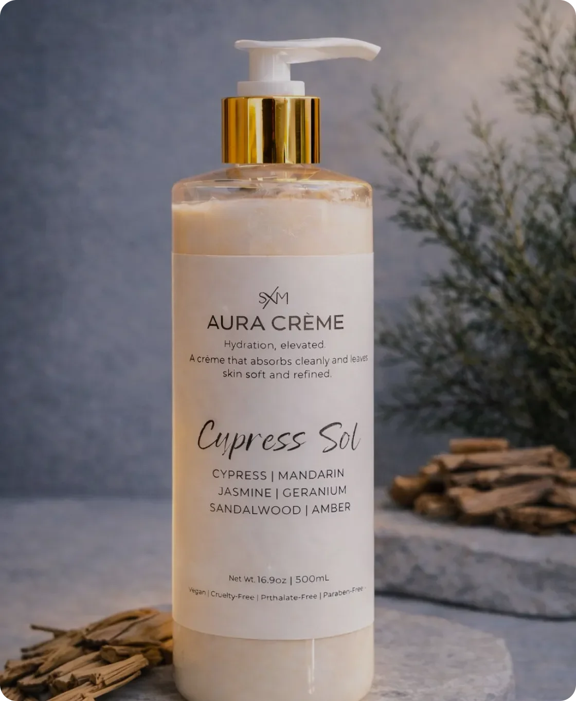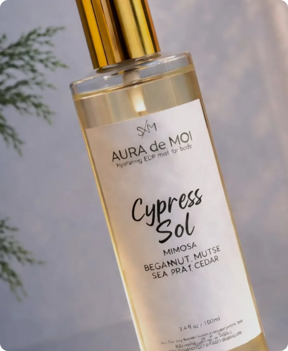 Cypress and mandarin open crisp and woody, lifted by jasmine and geranium, settling into sandalwood and amber — earth meets sea in serene stillness.